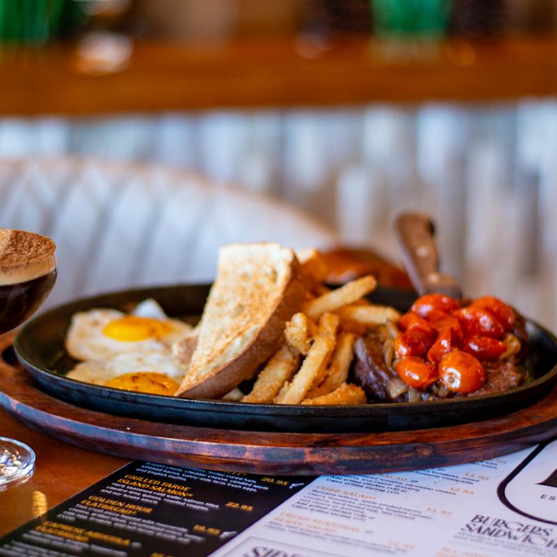 Sizzling butter-seared filet steak and sunny-side-up farm eggs, served on a cast-iron pan with tomatoes, caramelized onions, French fries, and toasted sourdough.